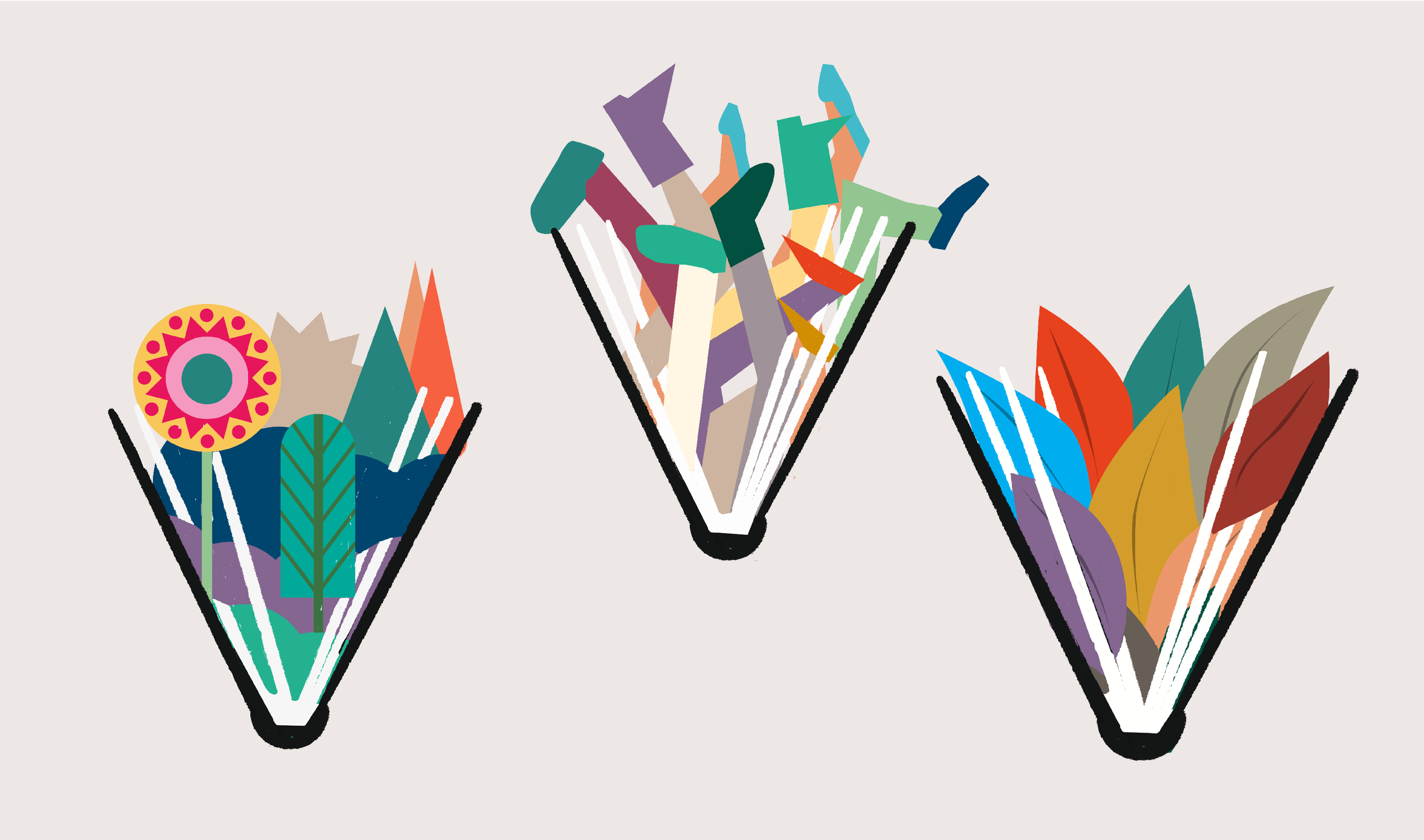 Un any, vam fer uns personatges amb cos de llibre obert i formes estrafolàries, un altre vam fer llibres que s’obrien i en sortien formes imaginàries de colors, animals, contes, personatges. Escenes on apareixen llibres integrats a la ciutat, mons que s’obren quan gaudeixes de la lectura, Persones sense gènere de tota mena, que llegeixen i molt…