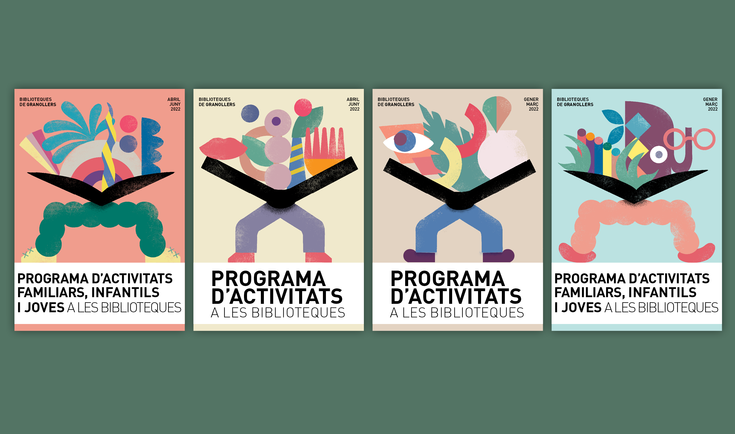 La idea cada any és a partir d’un concepte desenvolupar les 6 portades que conviuen a les dues biblioteques de la ciutat amb un mateix concepte al darrere. Amb la gràfica de les portades també dissenyem uns rolls-ups que acompanyaran a aquestes activitats presencials que es fan en els diferents espais, per reforçar la imatge de cada període.